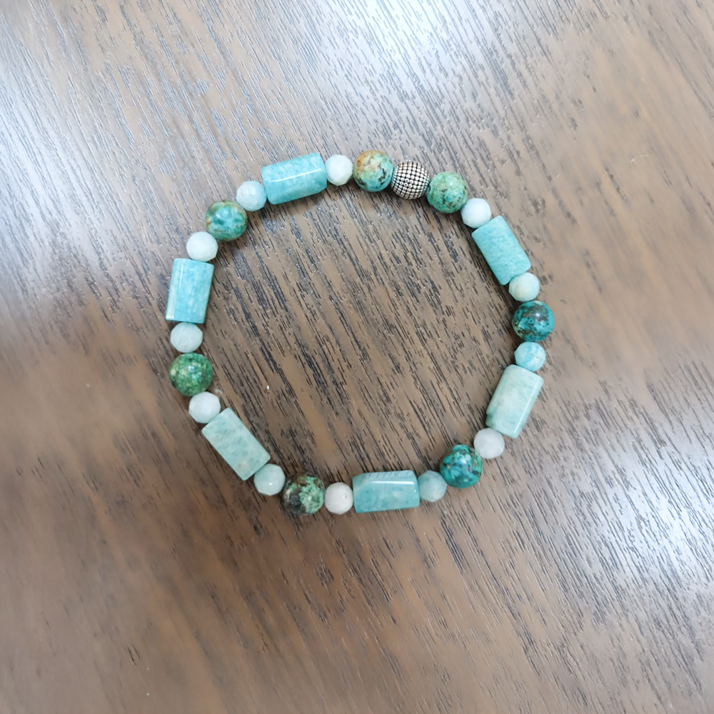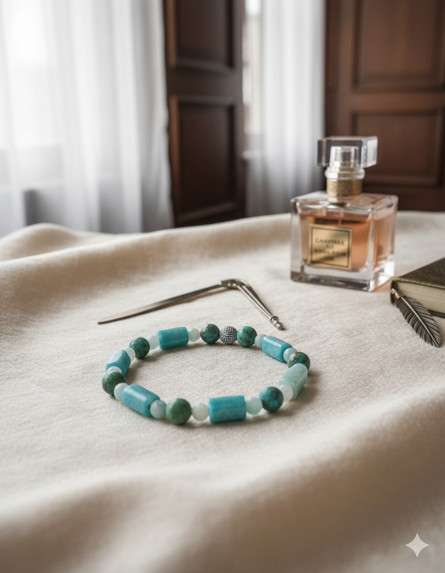 Bilekliğimiz, şık ve dayanıklı silindir kesim tasarımıyla, doğal taşlarla özenle kombinlenmiştir.