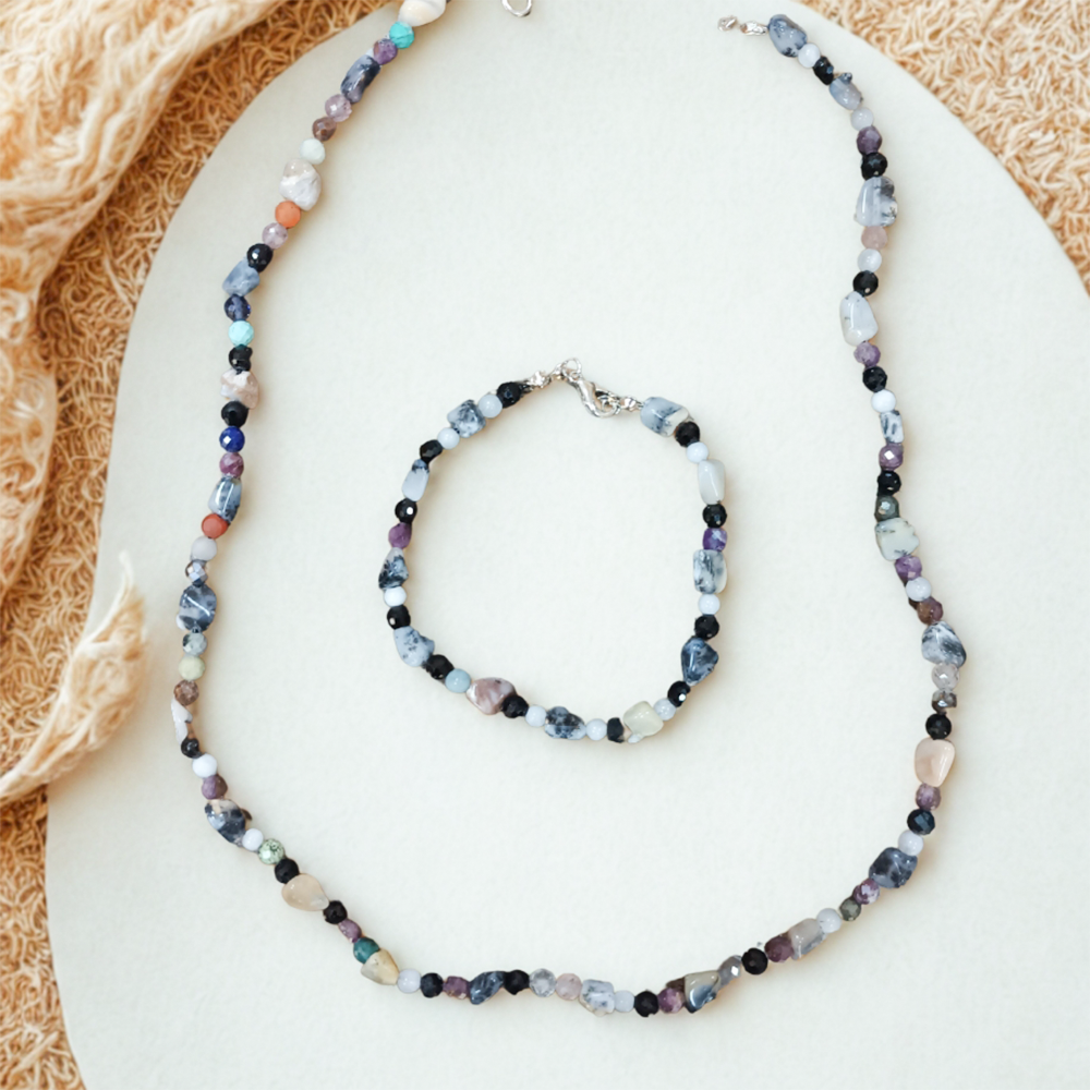 Kolye ve bilekliğimiz, ruhsal sıkıntılara karşı rahatlatıcı etkileriyle bilinen doğal taşlarla özenle hazırlanmıştır.